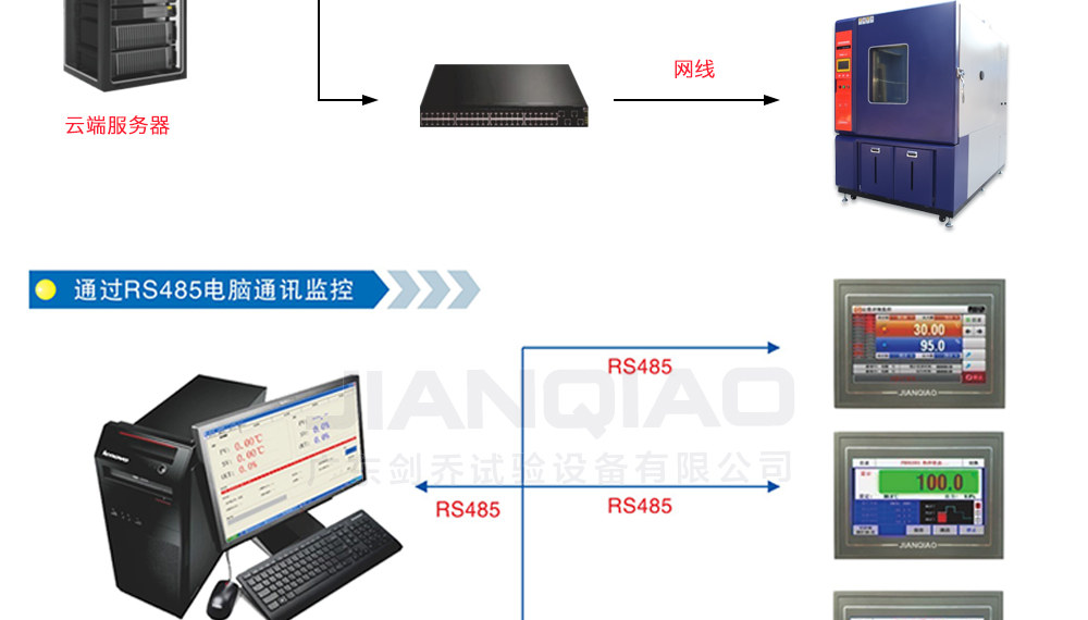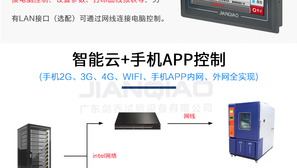 用途:廣東劍喬新款-可程式恒溫恒濕試驗箱1400L(屬于:非標定制款)主要用來測試各種材料耐熱、耐寒、耐干、耐濕的性能。本機采用智能中英俄文顯示7寸彩色觸控式屏幕畫面,操作簡單,程序編