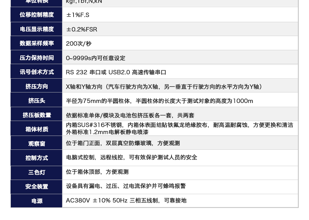 用途:電池包擠壓試驗(yàn)機(jī)模擬各類動(dòng)力動(dòng)力電池包和系統(tǒng)在運(yùn)輸、儲(chǔ)存及使用過程中電池包遭受碰撞擠壓的情形,人工呈現(xiàn)電池在遭受擠壓時(shí)可能出現(xiàn)的不同狀況。