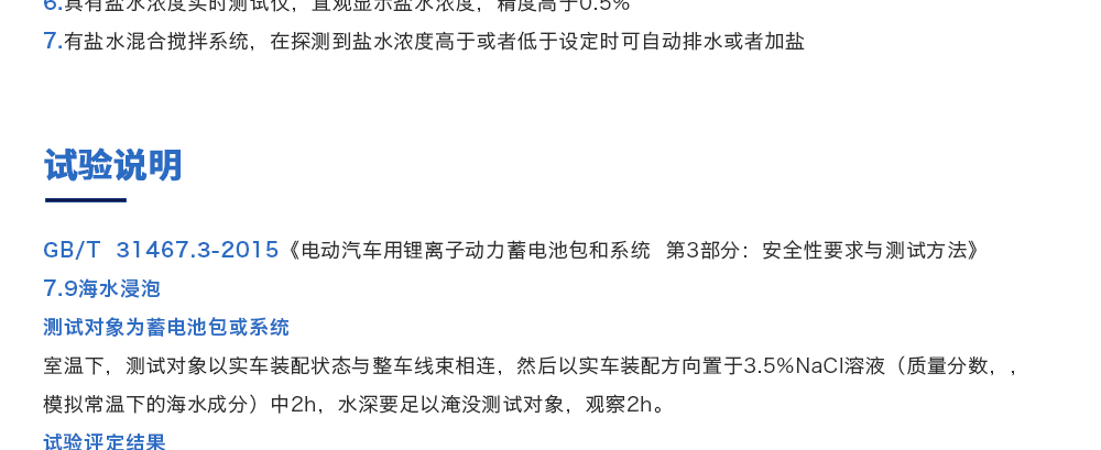 用途:海水浸泡試驗裝置主要用于電池以實車裝配狀態與整車線束相連然后以實車裝配方向在常溫下的海水成分中浸泡2h(海水為模擬海水成分,濃度為3.5%NaCl溶液)水槽中海水深度要足以淹