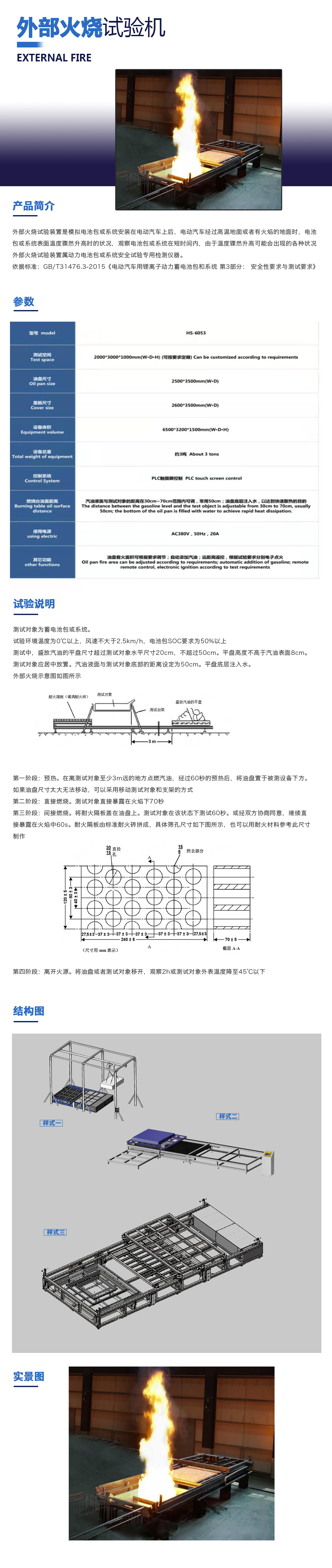 用途:外部火燒試驗(yàn)裝置是模擬電池包或系統(tǒng)安裝在電動(dòng)汽車(chē)上后,電動(dòng)汽車(chē)經(jīng)過(guò)高溫地面或者有火焰的地面時(shí),電池包或系統(tǒng)表面溫度驟然升高時(shí)的狀況,觀察電池包或系統(tǒng)在短時(shí)間內(nèi),由
