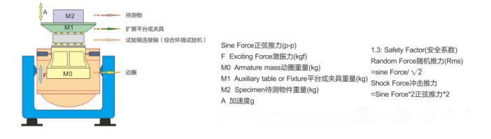 由于三軸電磁振動(dòng)臺(tái)的主參數(shù)是以激振力大小命名與排序的,根據(jù)已知的參數(shù),利用∑ m x a= ( mmm+ m4) x a計(jì)算出激振力的大小,并加1.3安全系數(shù),便能確定在加速度區(qū)域所需的激振力的大小,并以此作為選定相應(yīng)型號(hào)的依據(jù)。