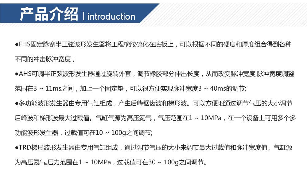 用途:FHS固定脈寬半正弦波形發(fā)生器將工程橡膠硫化在底板上,可以根據(jù)不同的硬度和厚度組合得到各種不同的沖擊脈沖寬度。